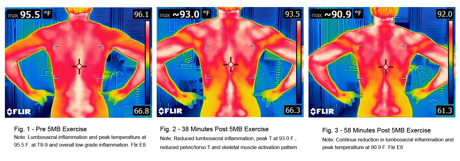 The referenced 3 images illustrate the effects of 1 session of 5MinuteBack™ Advanced/Extreme (5 minutes floor and 5 minutes band). Of note is approximately 70% reduction in spinal, pelvic and lumbar joint and muscle inflammation, the 4.6 degree F. drop in T8-9 focal inflammation (cross hairs). Continued activation of skeletal muscles at 38 minutes is evident.